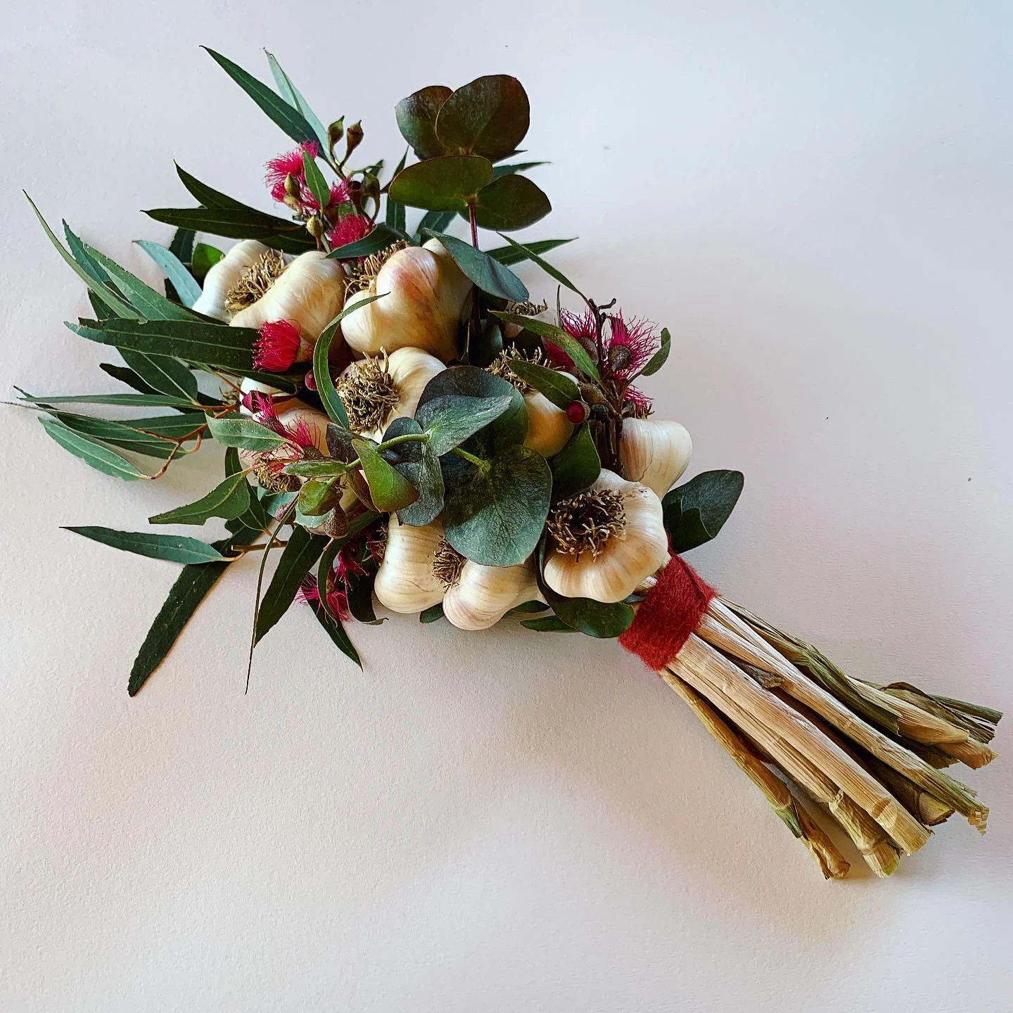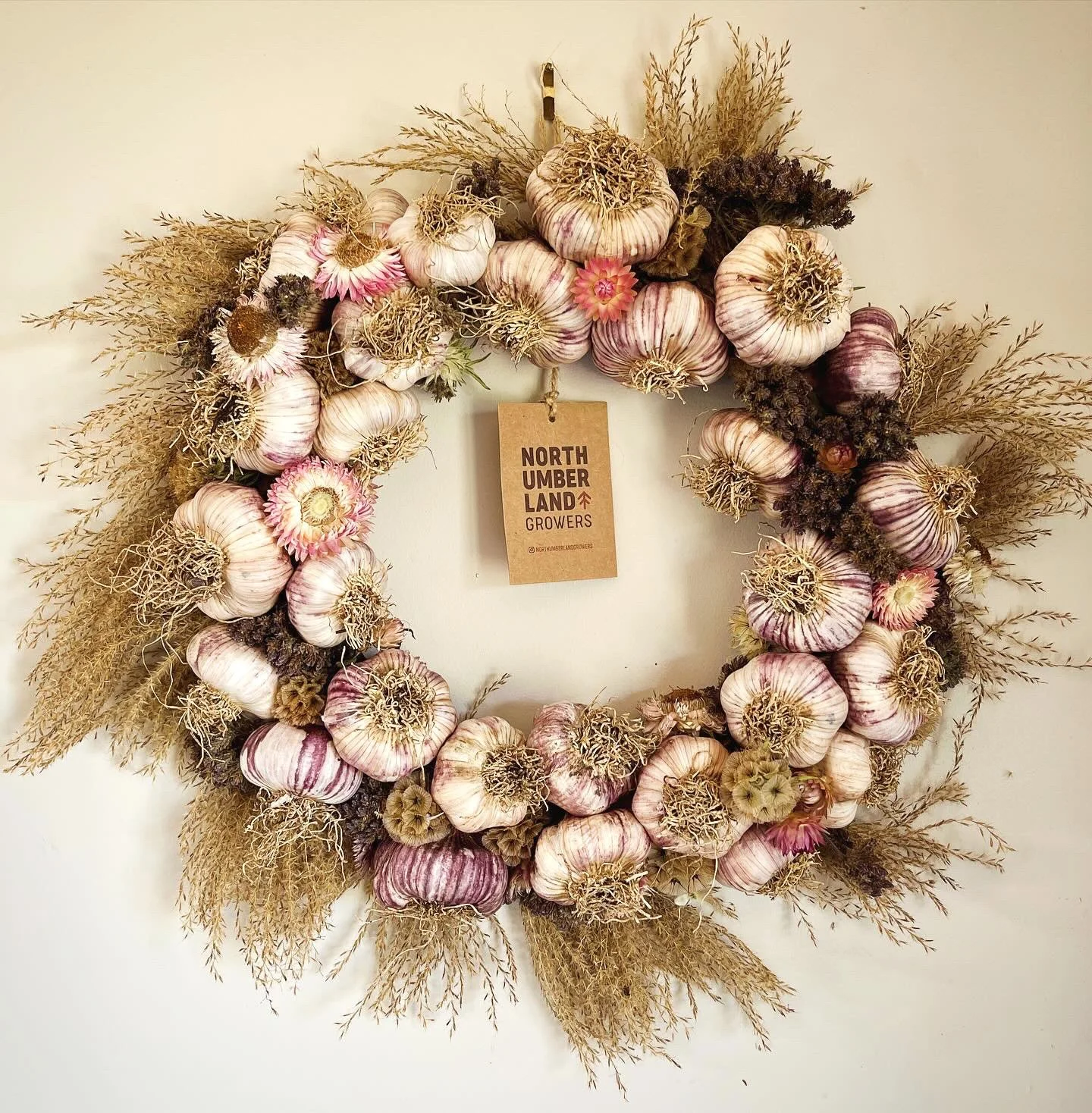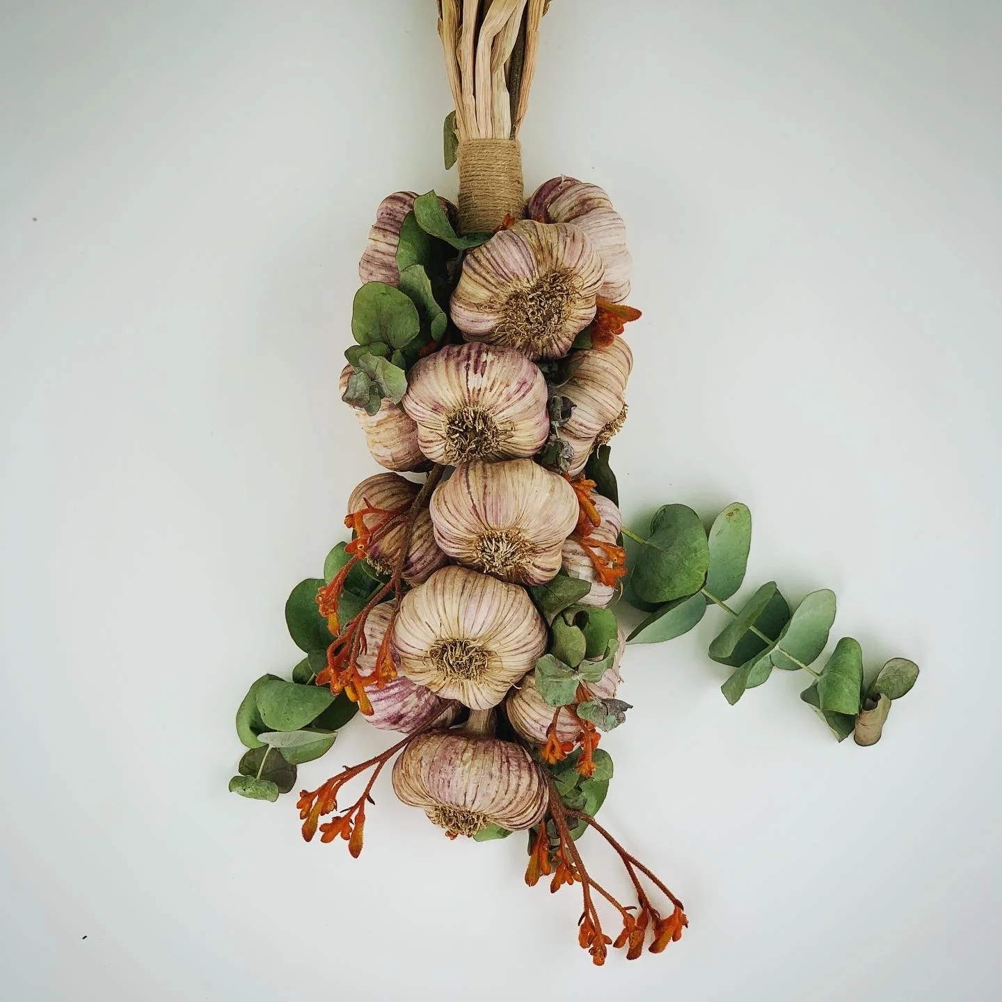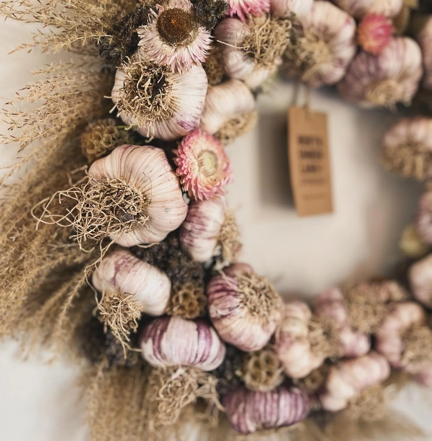 We grow excellent garlic which we weave into wreaths and bouquets with our flowers. It’s an attractive way to have garlic on hand at all times, and they make wonderful gifts.